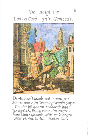 Description: The plumber uses bellows to heat the fire under the solder and soldering iron. A second worker on a ladder listens to the directions from a woman pointing to a problem area. In the background is a city scene with a woman carrying a pail of water into a house. The Dutch artist and poet, Jan Luiken (1649-1712), was responsible for drawing this emblem and for creating the motto and poem that follow. Jan Luiken and/or his son Casper Luiken (1672-1708) were responsible for its etching. The attendant scripture text is Isaiah 45:8. Motto: Guide it well, / In the mind. Poem: Man, in order to catch the rain from the sky,/Builds downspouts on his house, / Because wants to have his necessities: /It is sensible, if only he didn’t let the rain/Of God’s mercy, love, and blessing, /Flow outside the heart-vessel. (Translation by Josephine V. Brown, with editorial assistance from William G. Stryker).