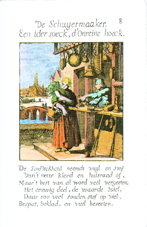 Description: The brush maker displays his wares around his open store window. He is in the process of selling a clothes brush to a woman who is trying it out. In the background is a city scene with a canal, bridge, a church and houses. The Dutch artist and poet, Jan Luiken (1649-1712), was responsible for drawing this emblem and for creating the motto and poem that follow. Jan Luiken and/or his son Casper Luiken (1672-1708) were responsible for its etching. The attendant scripture text is Psalm 51:10, though Luiken quotes Psalm 51:12. Motto: Everyone should seek / The dirty corner. Poem: Tidiness removes dirt and dust, / From the neat garment and furniture; /But the best of all is oft forgotten, / The eternal part, the worthy soul, / On which so much dust from sins fell, /Splashed, spattered, and covered with dirt. (Translation by Josephine V. Brown, with editorial assistance from William G. Stryker).