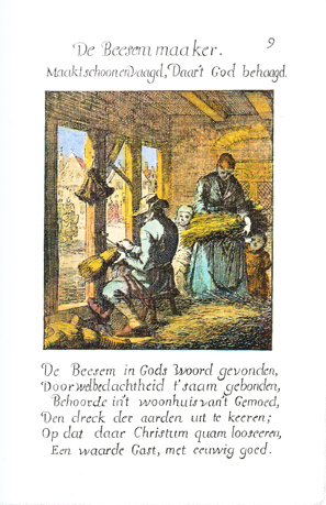 Description: The broom maker, sitting in his workshop in front of an open window, ties together the straw bristles of a broom, while a woman with two small children brings more bristles. The Dutch artist and poet, Jan Luiken (1649-1712), was responsible for drawing this emblem and for creating the motto and poem that follow. Jan Luiken and/or his son Casper Luiken (1672-1708) were responsible for its etching. The attendant scripture text is Luke 15:8-10. Motto: Clean and sweep, / As it pleases God. Poem: The broom found in God’s words, /Tied together through careful thought, /Should in the house of the heart/Drive away the dirt of the earth,/So that Christ would come to stay there, /A worthy guest, with eternal goods. (Translation by Josephine V. Brown, with editorial assistance from William G. Stryker).