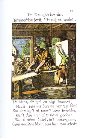 Description: The nap shearer shears a bolt of woolen fabric. Bolts of fabric are carried into the workshop to be hung and treated with teasing combs. The Dutch artist and poet, Jan Luiken (1649-1712), was responsible for drawing this emblem and for creating the motto and poem that follow. Jan Luiken and/or his son Casper Luiken (1672-1708) were responsible for its etching. The attendant scripture text is Genesis 3:21. Motto: He is wise, who makes the garment, / That never wears out. Poem: Man, who spends time and diligence, / Makes his garment of animal hair: /Thus he can prepare the all for the flesh; / If then it weren’t too poorly done, / So that the poor soul, in passing,/Must part from here, utterly naked and bare! (Translation by Josephine V. Brown, with editorial assistance from William G. Stryker).