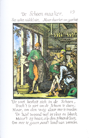 Description: The shoemaker stands in front of a client who sits on a stool and tries on a shoe. In the background are three workers; a woman carrying a small child enters the workshop. The Dutch artist and poet, Jan Luiken (1649-1712), was responsible for drawing this emblem and for creating the motto and poem that follow. Jan Luiken and/or his son Casper Luiken (1672-1708) were responsible for its etching. The attendant scripture text is Psalm 26:11-12. Motto: Don’t look at the means, / But why it happens. Poem: The foot encloses itself in the shoe, / Though with the shoe it has nothing to do; /Except, to walk with it on the road: /The soul does live in flesh and blood, /But they serve it, as the shoe the foot, /To go with it to the land of peace. (Translation by Josephine V. Brown, with editorial assistance from William G. Stryker).