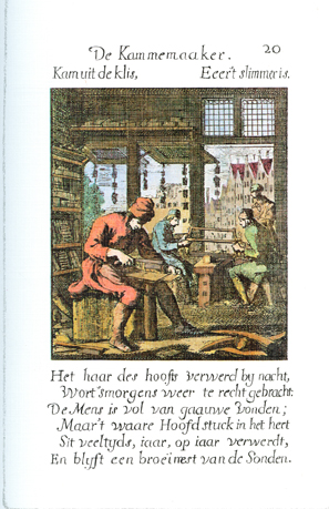 Description: Three comb makers are at work in a small workshop while a woman watches. A number of ivory tusks lie on the floor and combs hang from the open shutters. The Dutch artist and poet, Jan Luiken (1649-1712), was responsible for drawing this emblem and for creating the motto and poem that follow. Jan Luiken and/or his son Casper Luiken (1672-1708) were responsible for its etching. The attendant scripture text is Psalm 40:11-13 though Luiken quotes Psalm 40:12-14. Motto: Comb out the tangle, / Before it’s worse. Poem: The hair of the head, entangled at night, / Is in the morning put to right:/Man is full of quick inventions; / But the true head in the heart / Sits often in tangles year after year, /And remains a hotbed of sins. (Translation by Josephine V. Brown, with editorial assistance from William G. Stryker).