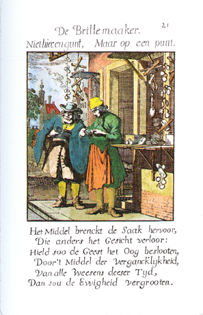 Description: In front of the optician’s store, a man tries out a pair of eyeglasses by reading a passage from a book. The optician stands next to him; several eyeglasses and telescopes are displayed on and from the opened shutters. The Dutch artist and poet, Jan Luiken (1649-1712), was responsible for drawing this emblem and for creating the motto and poem that follow. Jan Luiken and/or his son Casper Luiken (1672-1708) were responsible for its etching. The attendant scripture text is Matthew 13:13-17. Motto: Not here and there, / But to the point. Poem: The means brings the object in focus, /That otherwise could not be seen: /Did the spirit so keep the eye covered, / By means of the transitoriness, / Of all living beings,/Then eternity would be enlarged. (Translation by Josephine V. Brown, with editorial assistance from William G. Stryker).