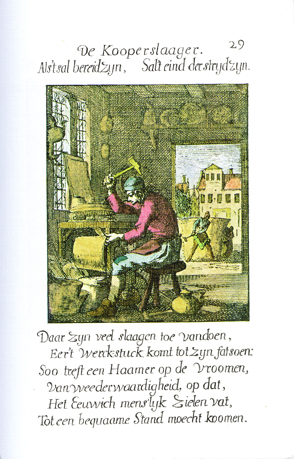 Description: The coppersmith sits on a stool and is about to strike a large cylinder with his hammer; pots, pans, and kettles are on the floor or on shelves in his workshop. Outside, two assistants work on a huge copper cauldron. The Dutch artist and poet, Jan Luiken (1649-1712), was responsible for drawing this emblem and for creating the motto and poem that follow. Jan Luiken and/or his son Casper Luiken (1672-1708) were responsible for its etching. The attendant scripture text is 2 Corinthians 4:8-11. Motto: When it’s ready, / It will be the end of the struggle. Poem: Many strokes have to fall, /Before the piece of work achieves its form: /So the hammer strikes the pious, /With adversity, so that/The eternal human soul’s vessel/Might achieve a proper shape. (Translation by Josephine V. Brown, with editorial assistance from William G. Stryker).