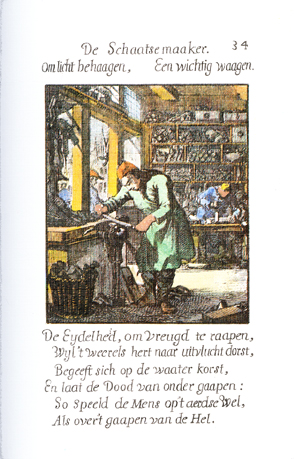 Description: In the foreground of the workshop, a skate maker is finishing the rounded wooden body of a skate and a second worker uses a chisel to begin the shaping of the wood block. Finished skates and tools hang on the wall, and supplies are stacked on the back shelves. The Dutch artist and poet, Jan Luiken (1649-1712), was responsible for drawing this emblem and for creating the motto and poem that follow. Jan Luiken and/or his son Casper Luiken (1672-1708) were responsible for its etching. The attendant scripture text is Job 37:10. Motto: For little pleasure, / A big hazard. Poem: Vanity, to reap pleasure, / Since the worldly heart thirsts for escape, / It embarks on the water’s crust, /And lets death gape from underneath: /So plays man on the earthly well, / Like over the gaping of hell. (Translation by Josephine V. Brown, with editorial assistance from William G. Stryker).