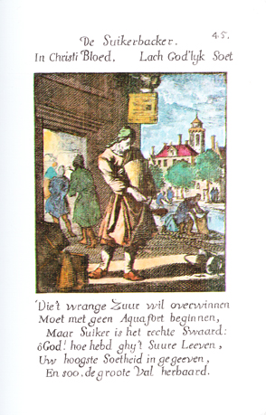 Description: The sugar refiner steps outside carrying a large sugar loaf, of which several lie already on the foreground; behind him three other workmen. Two workmen wash fabric in the canal; a church is situated on the other side of the canal. The Dutch artist and poet, Jan Luiken (1649-1712), was responsible for drawing this emblem and for creating the motto and poem that follow. Jan Luiken and/or his son Casper Luiken (1672-1708) were responsible for its etching. The attendant scripture text is Proverbs 16:24. Motto: Christ’s blood, / Contained divine sweetness. Poem: He who wants to conquer sourness, /Must not start with saltpeter, / But sugar is the right sword:/Oh God! How thou hast given to the sour life/Thy highest sweetness, / And hast thus reformed the great fall. (Translation by Josephine V. Brown, with editorial assistance from William G. Stryker).