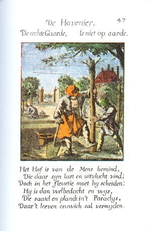 Description: The gardener, together with his helper, is in process of planting a tree; both are tamping down the soil around the trunk. In the right background there is a country house. The Dutch artist and poet, Jan Luiken (1649-1712), was responsible for drawing this emblem and for creating the motto and poem that follow. Jan Luiken and/or his son Casper Luiken (1672-1708) were responsible for its etching. The attendant scripture text is Genesis 2:8. Motto: The right garden / Is not on earth. Poem: The garden is loved by man, /Who finds there his delight and refuge;/Though when it’s blooming he must depart: / He is then thoughtful and wise, / Who sows and plants in paradise, /Where life will never depart. (Translation by Josephine V. Brown, with editorial assistance from William G. Stryker).