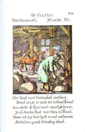 Description: In a large mill, the grain chandler scoops the grain from a sack into a wooden sieve. Around him lie several sacks with grain and behind him a horse turns the grinding wheels. The Dutch artist and poet, Jan Luiken (1649-1712), was responsible for drawing this emblem and for creating the motto and poem that follow. Jan Luiken and/or his son Casper Luiken (1672-1708) were responsible for its etching. The attendant scripture text is Matthew 13:33. Motto: What’s inside / Is the true kernel. Poem: The kernel, uncovered from the husk: /Becomes properly only then edible bread: / So is the kernel of human life contained /In the earthly husk of flesh and blood, /From which she is wonderfully released: /When God performs the correct separation. (Translation by Josephine V. Brown, with editorial assistance from William G. Stryker).
