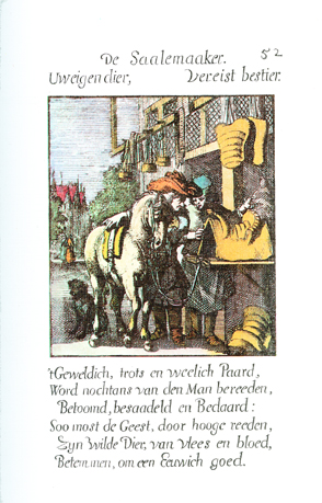 Description: The rider stands with his horse and dog in front of a saddlery and examines the saddle shown to him by the saddler. A second saddle lies under the display shelf; several stirrups hang from pegs above the windows. The Dutch artist and poet, Jan Luiken (1649-1712), was responsible for drawing this emblem and for creating the motto and poem that follow. Jan Luiken and/or his son Casper Luiken (1672-1708) were responsible for its etching. The attendant scripture text is Psalm 20:7 though Luiken quotes Psalm 20:8. Motto: Your own animal / Requires control. Poem: The powerful, proud, and well-appointed horse, / Is nevertheless ridden by the man, /Bridled, saddled, and calmed: /So the spirit should, through proper outfitting, /Tame its wild animal of flesh and blood/For an eternal good. (Translation by Josephine V. Brown, with editorial assistance from William G. Stryker).