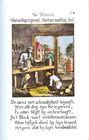 Description: The turner sits at his lathe, turning the leg of a table; in front of him on the floor is an apprentice who holds a finished table leg under his arm. Behind him, a man watches through the window; through the open door two women can be seen at the canal. The Dutch artist and poet, Jan Luiken (1649-1712), was responsible for drawing this emblem and for creating the motto and poem that follow. Jan Luiken and/or his son Casper Luiken (1672-1708) were responsible for its etching. The attendant scripture text is Luke 16:8. Motto: The Discoveries are many, / Though few for the eternal soul. Poem: Man, gifted with ingenuity, / Knows how to make his demand on all things; /And he himself remains unrefined / In the block of the unhewn life: / Wouldn’t it be laudable, if he did with his spirit, /What he does with his craft. (Translation by Josephine V. Brown, with editorial assistance from William G. Stryker).