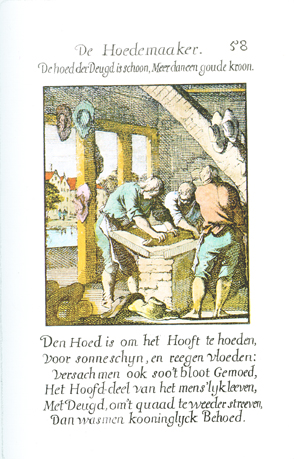 Description: Inside their workshop, three hatters are in the process of kneading wet felt fabric against two large stone slabs. A number of finished hats hang on the walls. A city canal can be seen through the open door, with houses and passersby on the opposite side. The Dutch artist and poet, Jan Luiken (1649-1712), was responsible for drawing this emblem and for creating the motto and poem that follow. Jan Luiken and/or his son Casper Luiken (1672-1708) were responsible for its etching. The attendant scripture text is Psalm 91:4. Motto: The hat of virtue is beautiful, / More so than a gold crown. Poem: The hat serves to shield the head /From sunshine, and heavy rain: /If one would likewise cover the bare soul, /The principal part of the human life, /With virtue, to oppose evil, /Then one would be royally protected. (Translation by Josephine V. Brown, with editorial assistance from William G. Stryker).