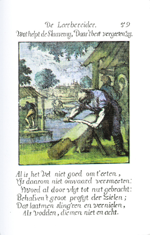 Description: Outside, under a tree, the tanner scrapes the animal hide with a two-handled knife. A second tanner works behind him in a work shed; on a platform in the canal, a third tanner washes tanned leather by treading on it with his bare feet. The Dutch artist and poet, Jan Luiken (1649-1712), was responsible for drawing this emblem and for creating the motto and poem that follow. Jan Luiken and/or his son Casper Luiken (1672-1708) were responsible for its etching. The attendant scripture text is Acts 10:1-6. Motto: What does slavery help, / As it would be best forgotten. Poem: Although the skin is not good for eating, /It’s therefore not as worthless rejected: / Through diligence everything is made useful /Except the great yield of the souls; /That is allowed to scatter and be destroyed /Like rags, that one doesn’t value at all. (Translation by Josephine V. Brown, with editorial assistance from William G. Stryker).