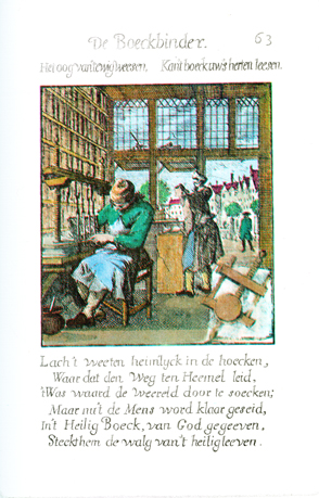 Description: In a large airy workshop and bookstore, a bookbinder is in the process of sewing the signatures of printed pages. A second binder pounds the folded signatures flat with a heavy wooden mallet. On the floor are a circular knife and a glue pot. Bound books are displayed on the bookshelves. The Dutch artist and poet, Jan Luiken (1649-1712), was responsible for drawing this emblem and for creating the motto and poem that follow. Jan Luiken and/or his son Casper Luiken (1672-1708) were responsible for its etching. The attendant scripture text is 2 Timothy 3:16-17. Motto: The eye of the eternal being / Can read the book of your heart. Poem: If knowledge lay secretly in the corners, / Where the path led to heaven, / It would be worthwhile to search the world: /However now that man has been clearly taught /In the holy scripture, given by God,/He loathes the righteous life. (Translation by Josephine V. Brown, with editorial assistance from William G. Stryker).