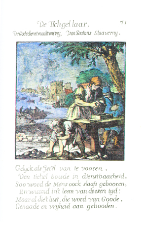 Description: Under a tree, a brick maker forces the kneaded clay into a wooden mold. A helper kneads clay (left) and a barefooted young man picks up lumps of raw clay from the ground (right). The scene is set next to a busy river. The Dutch artist and poet, Jan Luiken (1649-1712), was responsible for drawing this emblem and for creating the motto and poem that follow. Jan Luiken and/or his son Casper Luiken (1672-1708) were responsible for its etching. The attendant scripture text is Exodus 1:13-14. Motto: Divine service liberates us / From Satan’s slavery. Poem: As the Israelite of old / Made brick in servitude, /So man is also born servile: /And toils in the clay of this time: /But everyone who so desires will be /Offered God’s mercy and freedom. (Translation by Josephine V. Brown, with editorial assistance from William G. Stryker).