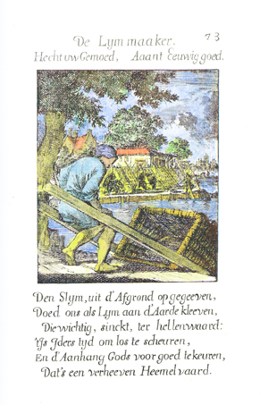 Description: Under a tree, the glue maker lowers a large wicker hamper into the water with the aid of support rails. On the opposite side of the water, other glue makers are at work and there is a large rack for drying animal hides. The Dutch artist and poet, Jan Luiken (1649-1712), was responsible for drawing this emblem and for creating the motto and poem that follow. Jan Luiken and/or his son Casper Luiken (1672-1708) were responsible for its etching. The attendant scripture text is Psalm 63:8 though Luiken cites Psalm 63:9. Motto: Fasten your soul/ To the eternal good. Poem: The slime, yielded from the abyss, /Makes us stick to the earth like glue, /That sinks heavily toward hell: /It’s everyone’s time to tear loose, /And to approve of the adherence to God, /That is an exalted ascension. (Translation by Josephine V. Brown, with editorial assistance from William G. Stryker).