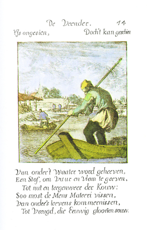 Description: The peat cutter dredges peat while standing in a shallow-bottomed boat. In the background, a second worker transfers peat from his boat to an open shed. In the far background, two men tread on peat to press out the excess water. The Dutch artist and poet, Jan Luiken (1649-1712), was responsible for drawing this emblem and for creating the motto and poem that follow. Jan Luiken and/or his son Casper Luiken (1672-1708) were responsible for its etching. The attendant scripture text is Matthew 5:3-4. Motto: It’s unseen, /Though it can have happened. Poem: From under the water is lifted /A material, to give fire and flame, / To benefit and defend against the cold: /So should man dredge matter /From underneath life’s sorrows / For joy, that brings forth eternal glories. (Translation by Josephine V. Brown, with editorial assistance from William G. Stryker).