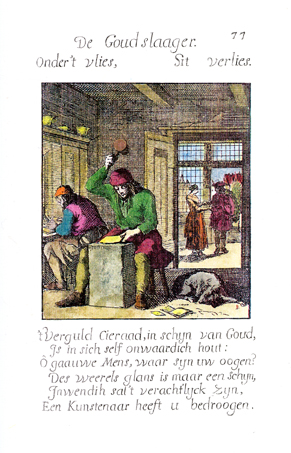 Description: Using a large mallet, the goldbeater pounds a lump of gold placed on a large stone into a thin sheet, while a dog sleeps at his side. To the left of him, a worker is gilding a book. In the shop in front of the workplace, a woman shows a gilded book to a man who carries a wooden frame that is to be gilded. The Dutch artist and poet, Jan Luiken (1649-1712), was responsible for drawing this emblem and for creating the motto and poem that follow. Jan Luiken and/or his son Casper Luiken (1672-1708) were responsible for its etching. The attendant scripture text is Luke 16:19-31. Motto: Under the covering/ Lies loss. Poem: The gilded adornment, looking like gold, / Is in its core worthless wood: /Oh Clever man, where are your eyes? /The world’s luster is only a façade, / Inside it will be disgraceful, /An artist has deceived you. (Translation by Josephine V. Brown, with editorial assistance from William G. Stryker).