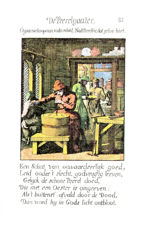 Description: In his workshop, the pearl borer uses a drill-bore to drill holes in pearls. At the entrance to a second room, two men examine pearls in a small bowl. The Dutch artist and poet, Jan Luiken (1649-1712), was responsible for drawing this emblem and for creating the motto and poem that follow. Jan Luiken and/or his son Casper Luiken (1672-1708) were responsible for its etching. The attendant scripture text is Matthew 7:6. Motto: oh Nimble merchant, search and bid / For the pearl, named Jesus. Poem: An invaluable treasure /Lies under the simple devout life, / Like the beautiful pearl, /That is surrounded by an oyster: /When the outside falls off through death, / He is revealed in God’s light. (Translation by Josephine V. Brown, with editorial assistance from William G. Stryker).
