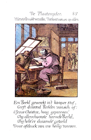 Description: The etcher is in the process of copying the image in front of him on the acid resistant surface of the copper plate. He sits in front of a window with a screen that diffuses the light. A second worker pours the acid used to etch the image in the copper surface from the plate into a bowl. Two men talk at the open front door. On the floor are several implements and containers used by etchers or engravers. The Dutch artist and poet, Jan Luiken (1649-1712), was responsible for drawing this emblem and for creating the motto and poem that follow. Jan Luiken and/or his son Casper Luiken (1672-1708) were responsible for its etching. The attendant scripture text is Romans 5:17-19. Motto: The restoration when it’s worn, /Transfers from one to all. Poem: An image, etched in the copper plate, /Gives up a thousand images: /oh Jesus Christ, highly praised! /Thou the most beautiful heavenly image, /Thou hast engendered thousands, /Through the imprint of thy holy being. (Translation by Josephine V. Brown, with editorial assistance from William G. Stryker).