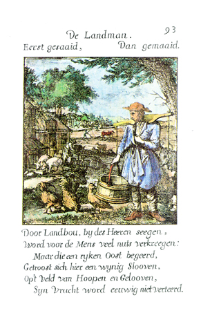 Description: Under a tree, the farmer, surrounded by cattle, chickens and a duck, carries a milk bucket. A farm, two pigs feeding from a trough and a woman cleaning butter churns are in the left background; in the distance, a man plows a field. The Dutch artist and poet, Jan Luiken (1649-1712), was responsible for drawing this emblem and for creating the motto and poem that follow. Jan Luiken and/or his son Casper Luiken (1672-1708) were responsible for its etching. The attendant scripture text is Psalm 65:9-13 though Luiken quotes Psalm 65: 10-14. Motto: First sowed, /Then reaped. Poem: Through farming, with the Lord’s blessing, /Is much benefit gained for man: / But he who desires a rich harvest, /Should console himself here with a little toiling, /On the field of hope and faith; /His fruit will not be consumed in eternity. (Translation by Josephine V. Brown, with editorial assistance from William G. Stryker).