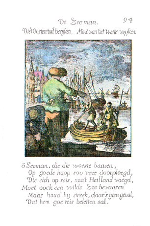 Description: At the edge of the wharf, a sailor with a furry hat speaks to a man on an approaching lighter; a man next to him is bent over a large bundle. In the harbor are a second lighter and several sailboats. On the left is a quay with a row of houses. The Dutch artist and poet, Jan Luiken (1649-1712), was responsible for drawing this emblem and for creating the motto and poem that follow. Jan Luiken and/or his son Casper Luiken (1672-1708) were responsible for its etching. The attendant scripture text is Psalm 107:23-32. Motto: Who wants to reach the East, /Must retreat from the West. Poem: Oh Sailor, who plows the desolate depths, /So far, in good hope, / He who journeys to the holy land, /Must also navigate a wild sea; /But if he stays on course, there is nothing, /That will hinder a good journey for him. (Translation by Josephine V. Brown, with editorial assistance from William G. Stryker).