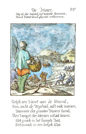 Description: The fisherman, holding a basket and \net, stands on a dune near the beach. Fish are in his basket and on the sand next to him. At the beach, several fishermen pull in a net with fish from the sea. In the background is a village in the dunes. The Dutch artist and poet, Jan Luiken (1649-1712), was responsible for drawing this emblem and for creating the motto and poem that follow. Jan Luiken and/or his son Casper Luiken (1672-1708) were responsible for its etching. The attendant scripture text is Matthew 4:18-22. Motto: All ye, who swim in the world’s streams,/ Thou canst not escape the large fishnet. Poem: Like a fishnet on the beach, /So, Wisdom says, it will also be, /When the hand of the great Fisherman, /Will sort the catch of men; /The good into a heavenly vessel, /And the bad into an ugly hole. (Translation by Josephine V. Brown, with editorial assistance from William G. Stryker).