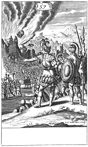 Description: The walls of Jericho begin to fall as the Israelites march around the city with the Ark of the Covenant and blow their trumpets. The name of the artist, Frederick Hendrick van Hove (1628-1698), has been set at the base, and as the numeral at the head of the page indicates, this is plate #57 in a series of illustrations.