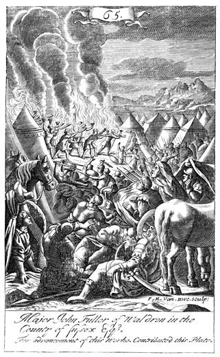 Description: Gideon's army defeats the Midianites. The name of the artist, Frederick Hendrick van Hove (1628-1698), has been set at the base, and as the numeral at the head of the page indicates, this is plate #65 in a series of illustrations.