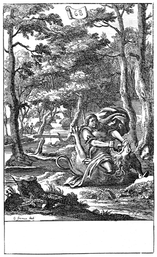 Description: Samson kills a lion with his bare hands. The names of the artist, G. Freman, and the engraver, Johannes Kip (1653-1722), have been set at the base, and as the numeral at the head of the page indicates, this is plate #68 in a series of illustrations.