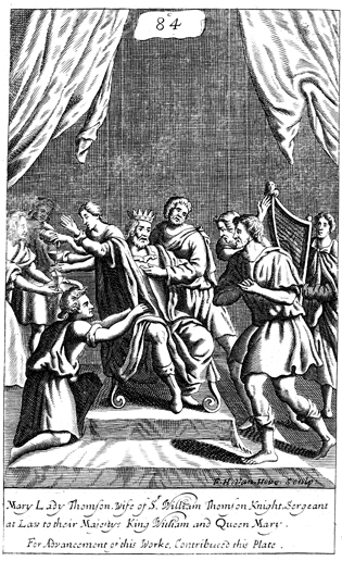 Description: David plays the harp to soothe Saul. The name of the artist, Frederick Hendrick van Hove (1628-1698), has been set at the base, and as the numeral at the head of the page indicates, this is plate #84 in a series of illustrations.