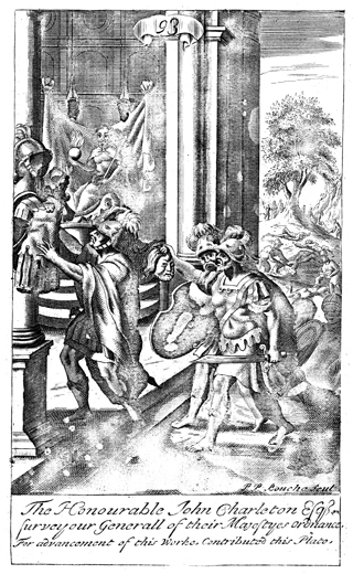 Description: The Philistine soldiers fasten Saul's armor to the Temple of the Ashtoreth's as they carry Saul's head. As the numeral at the head of the page indicates, this is plate #93 in a series of illustrations, and the name of the engraver, Peter Paul Bouche (b. ca. 1646), has been set at the base.
