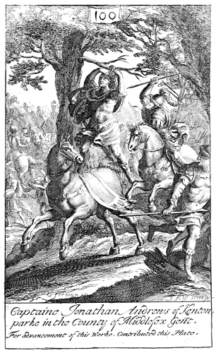 Description: While Absalom is defenseless, hanging by his hair (or head) from a tree, Joab seizes the opportunity to slay him. The names of the artist, G. Freman, and the engraver, Johannes Kip (1653-1722), have been set at the foot, and as the numeral at the head of the page indicates, this is plate #100 in a series of illustrations.