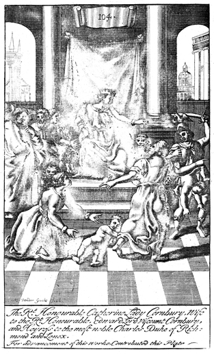Description: Solomon appears on his throne as two women approach, both claiming custody of a baby. Solomon's servant stands with drawn sword to divide the child between the two women. The name of the engraver, Michael van der Gucht (1660-1725), has been set at the foot, and as the numeral at the head of the page indicates, this is plate #104 in a series of illustrations.