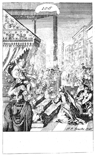 Description: The Queen of Sheba visits King Solomon in Jerusalem. As the numeral at the head of the page indicates, this is plate #106 in a series of illustrations, and the name of the engraver, Peter Paul Bouche (b. ca. 1646), has been set at the base.