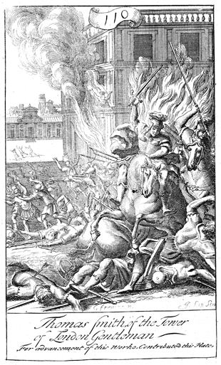 Description: Zimri sets his own palace on fire when he sees that Omri has succeeded in taking the city during the revolt. The names of the artist, G. Freman, and the engraver, Johannes Kip (1653-1722), have been set at the base, and as the numeral at the head of the page indicates, this is plate #110 in a series of illustrations.