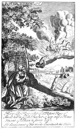 Description: Elisha receives Elijah's mantle upon seeing him taken to heaven in a chariot of fire. Elisha parts the water with the mantle he received from Elijah. As the numeral at the head of the page indicates, this is plate #116 in a series of illustrations.