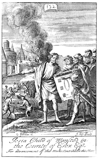 Description: Ezra leads the reconstruction of the temple. The names of the artist, G. Freman, and the engraver, Johannes Kip (1653-1722), have been set at the base, and as the numeral at the head of the page indicates, this is plate #132 in a series of illustrations.