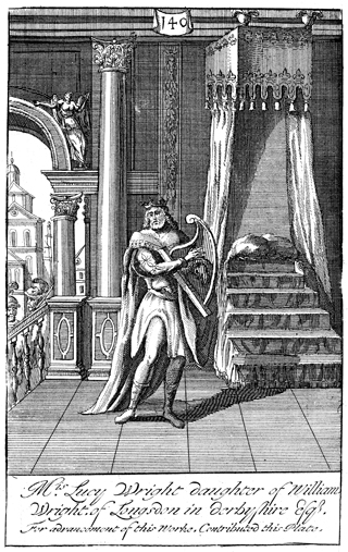 Description: David is depicted as the Psalmist with harp in hand. As the numeral at the head of the page indicates, this is plate #140 in a series of illustrations.
