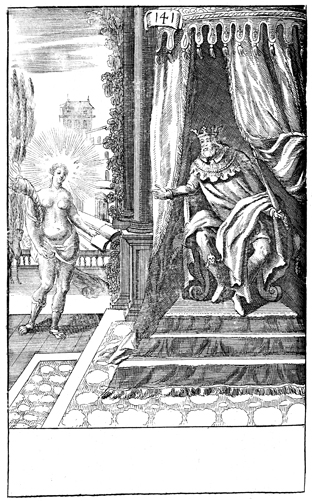 Description: King Solomon is depicted as the author of the wisdom literature with Lady Wisdom nearby. As the numeral at the head of the page indicates, this is plate #141 in a series of illustrations.