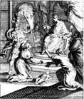 Description: Solomon appears on his throne as two women approach, both claiming custody of a baby. Solomon's servant stands with drawn sword to divide the child between the two women.
