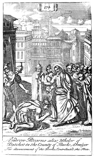 Description: The Roman Centurion asks Jesus to heal his servant. The name of the engraver’s name, Michael van der Gucht (1660-1725), has been set at the foot, and as the numeral at the head of the page indicates, this is plate #174 in a series of illustrations.