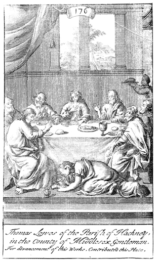 Description: Jesus is anointed by a sinful woman at the house of Simon the Pharisee. The names of the artist, G. Freman, and the engraver, Johannes Kip (1653-1722), have been set at the base, and as the numeral at the head of the page indicates, this is plate #176 in a series of illustrations.
