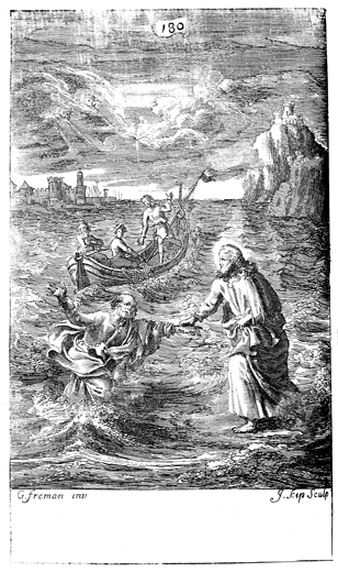 Description: Jesus saves Peter as he begins to sink while walking on water. The names of the artist, G. Freman, and the engraver, Johannes Kip (1653-1722), have been set at the base, and as the numeral at the head of the page indicates, this is plate #180 in a series of illustrations.