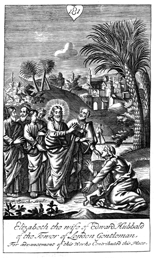 Description: The Canaanite woman begs Jesus to heal her daughter; a dog is at her feet representing their conversation. As the numeral at the head of the page indicates, this is plate #181 in a series of illustrations, and the name of the engraver, Peter Paul Bouche (b. ca. 1646), has been set at the base.
