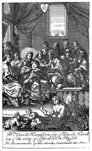 Description: Jesus teaches his disciples that to be great means becoming as the little children. As the numeral at the head of the page indicates, this is plate #183 in a series of illustrations, and the name of the engraver, Peter Paul Bouche (b. ca. 1646), has been set at the base.