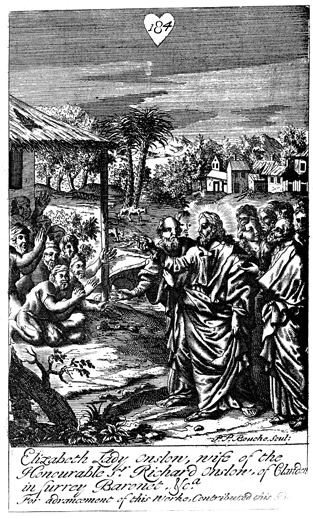 Description: Jesus heals ten lepers. As the numeral at the head of the page indicates, this is plate #184 in a series of illustrations, and the name of the engraver, Peter Paul Bouche (b. ca. 1646), has been set at the base.