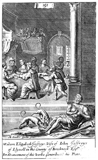 Description: Lazarus sits at the gate of the rich man, who lives in luxury. The name of the artist’s name, Michael van der Gucht (1660-1725), has been set at the foot, and as the numeral at the head of the page indicates, this is plate #191 in a series of illustrations.