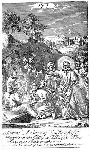 Description: Jesus raises Lazarus from the dead. As the numeral at the head of the page indicates, this is plate #194 in a series of illustrations, and the name of the engraver, Peter Paul Bouche (b. ca. 1646), has been set at the base.