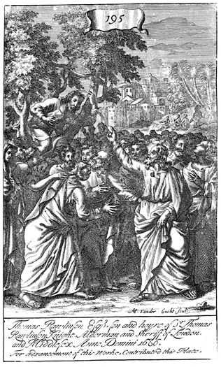 Description: Jesus speaks to Zacchaeus, who has climbed a sycamore tree in order to see Him. The name of the engraver’s name, Michael van der Gucht (1660-1725), has been set at the foot, and as the numeral at the head of the page indicates, this is plate #195 in a series of illustrations.
