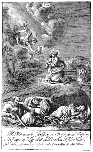 Description: In the Garden of Gethsemane, the disciples sleep while Jesus prays that his cup may pass; in the background, the soldiers arrive to arrest him. The names of the artist, G. Freman, and the engraver, Johannes Kip (1653-1722), have been set at the base, and as the numeral at the head of the page indicates, this is plate #202 in a series of illustrations.